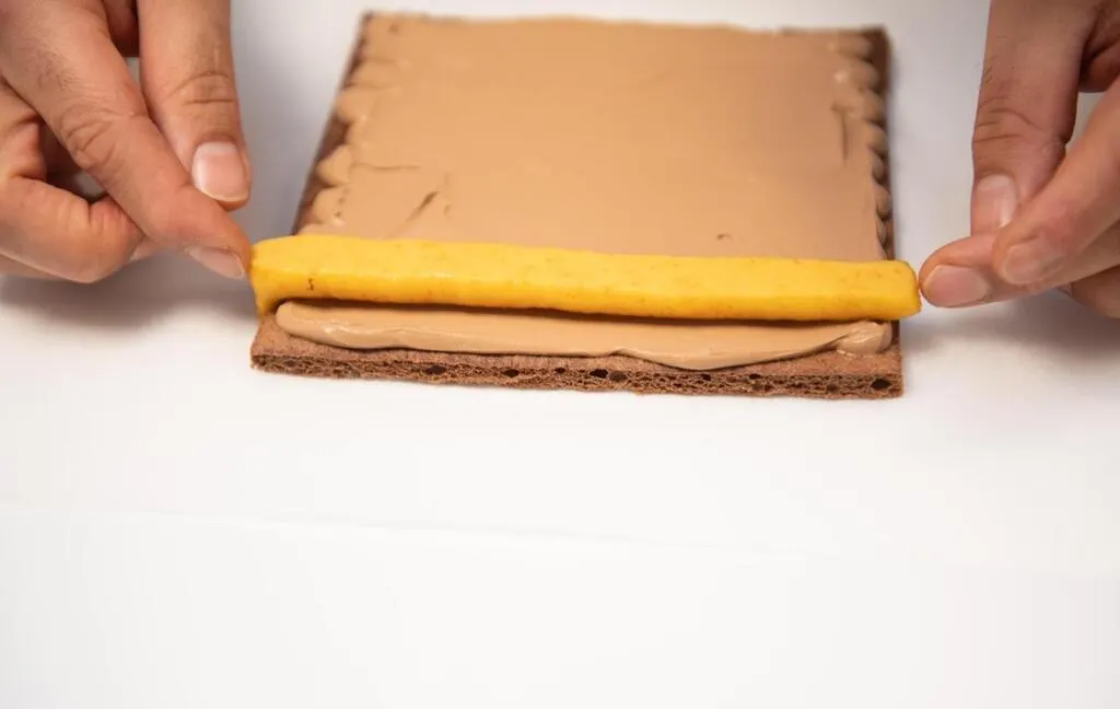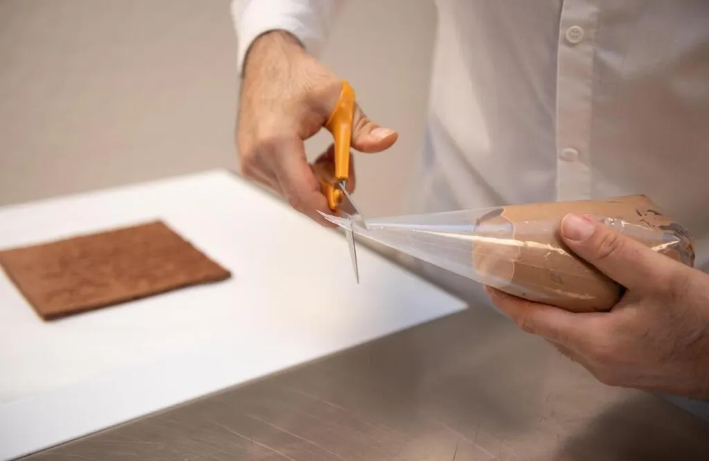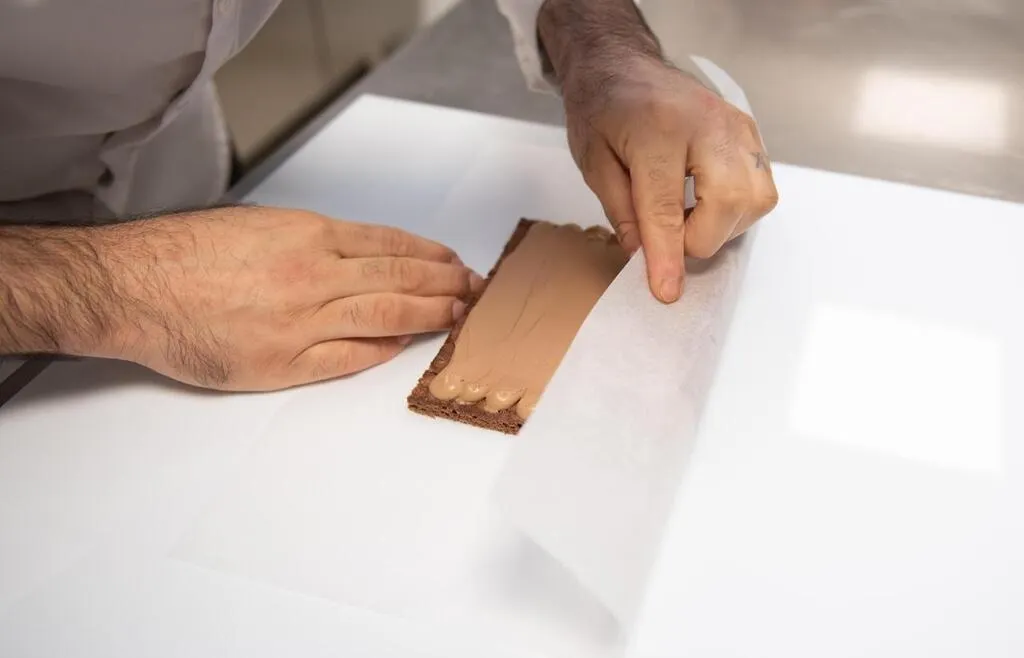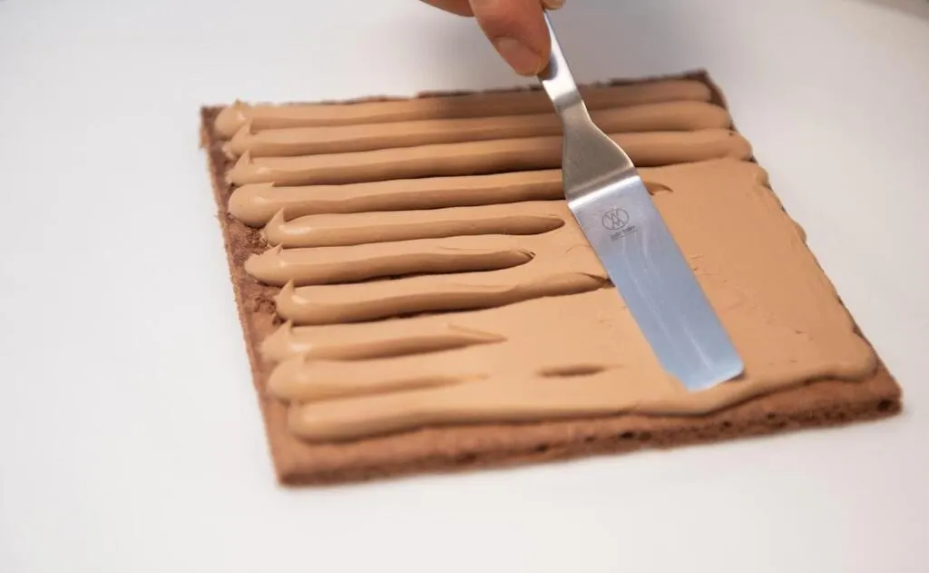 Étaler la ganache sur le biscuit coupé en carré. DAVID ADEMAS / OUEST-FRANCE