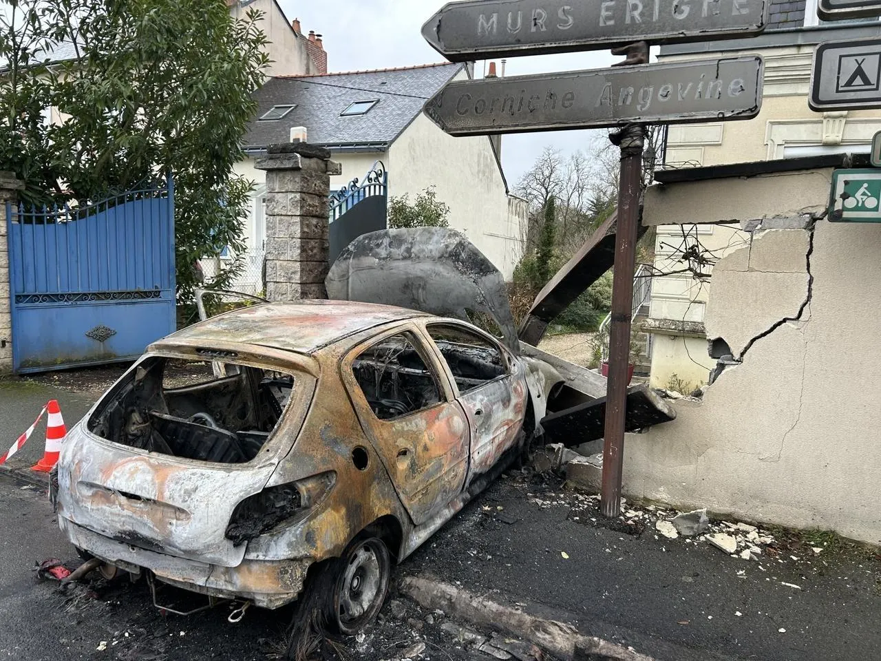 La carcasse entièrement calcinée permet de deviner qu’il s’agissait d’une Peugeot 206. Ce véhicule est venu s’encastrer dans le mur d’une propriété située rue Maurice-Berne aux Ponts-de-Cé, près d’Angers, vers 1 heure du matin dans la ...
