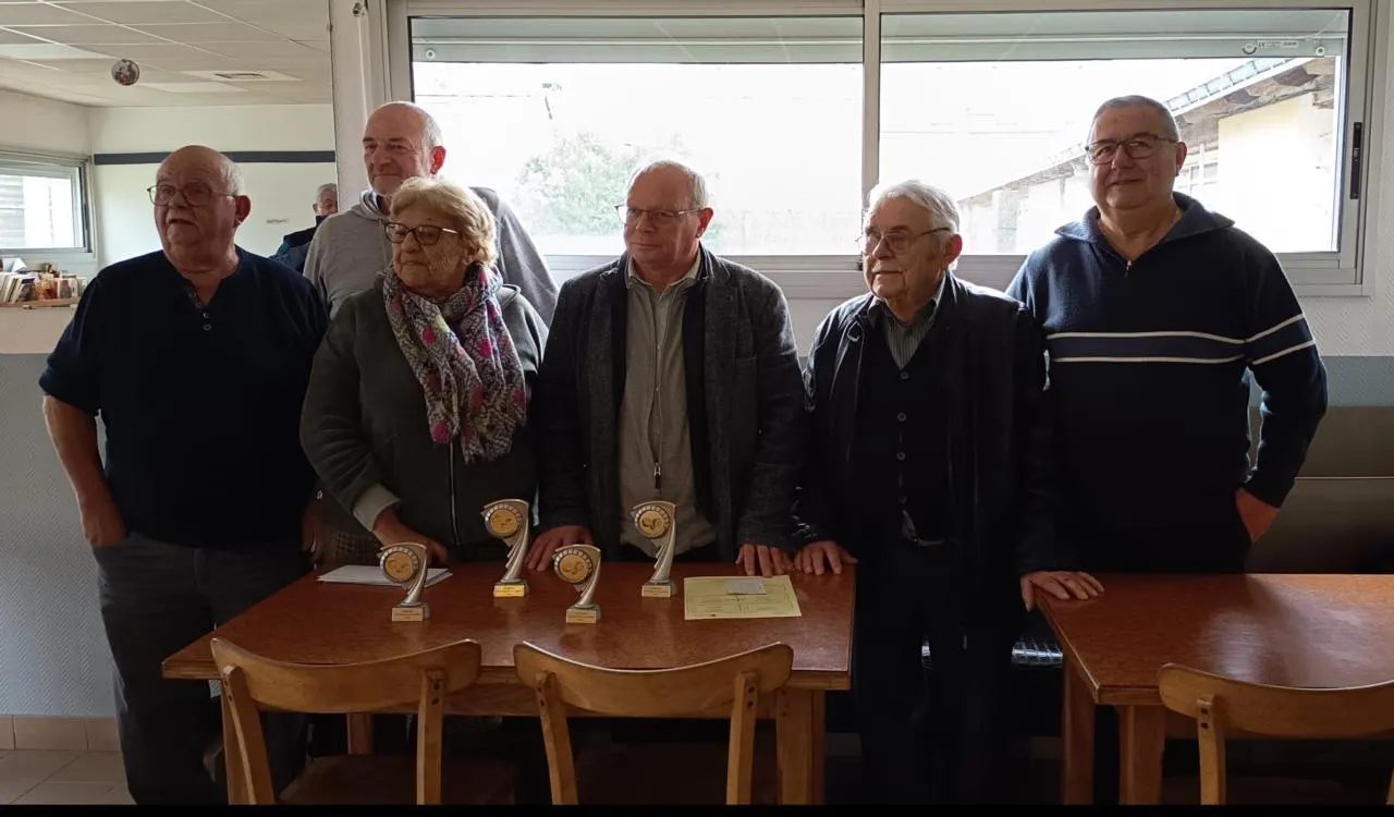 Samedi 13 décembre à Pellouailles, le challenge de boule de fort a livré son verdict. Les gagnants, Michel Chagneau et Michel Vouhé, ont remporté la finale contre Michel Charruau et Jacques Marteau. De gauche à droite : Michel Chagneau, Michel Vouhé, Marie-Paule Pirès, Jean-Pierre Mignot, Michel Charruau et Jacques Marteau. © CO