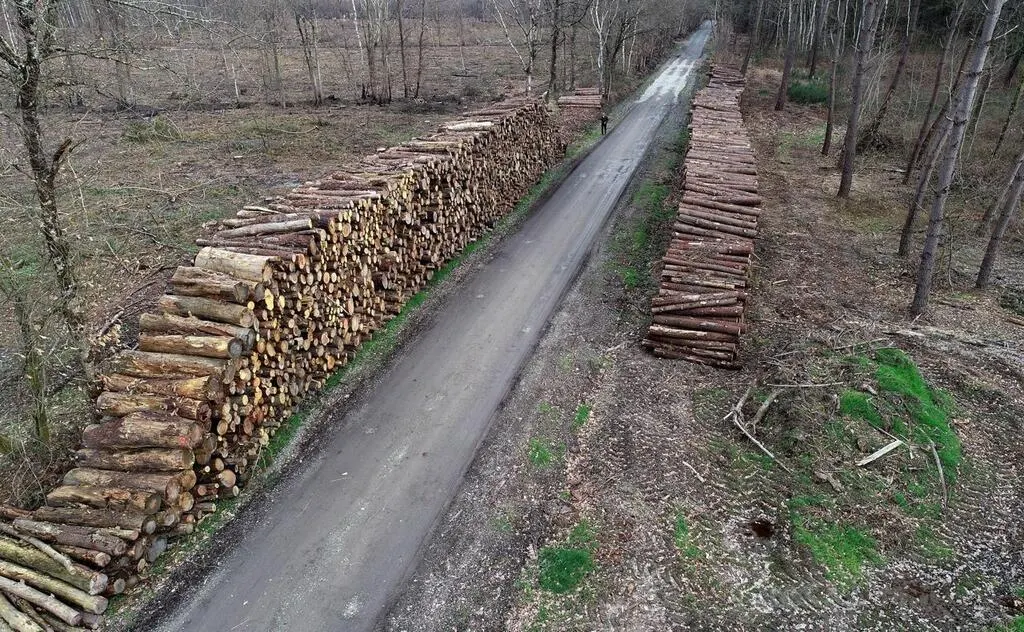 Le long des routes et chemins qui sillonnent la forêt de Baugé (Maine-et-Loire) des tas de billes de bois brûlés par l’incendie d’août 2022 s’alignent en attendant leur commercialisation. © Jérôme Fouquet/Ouest-France