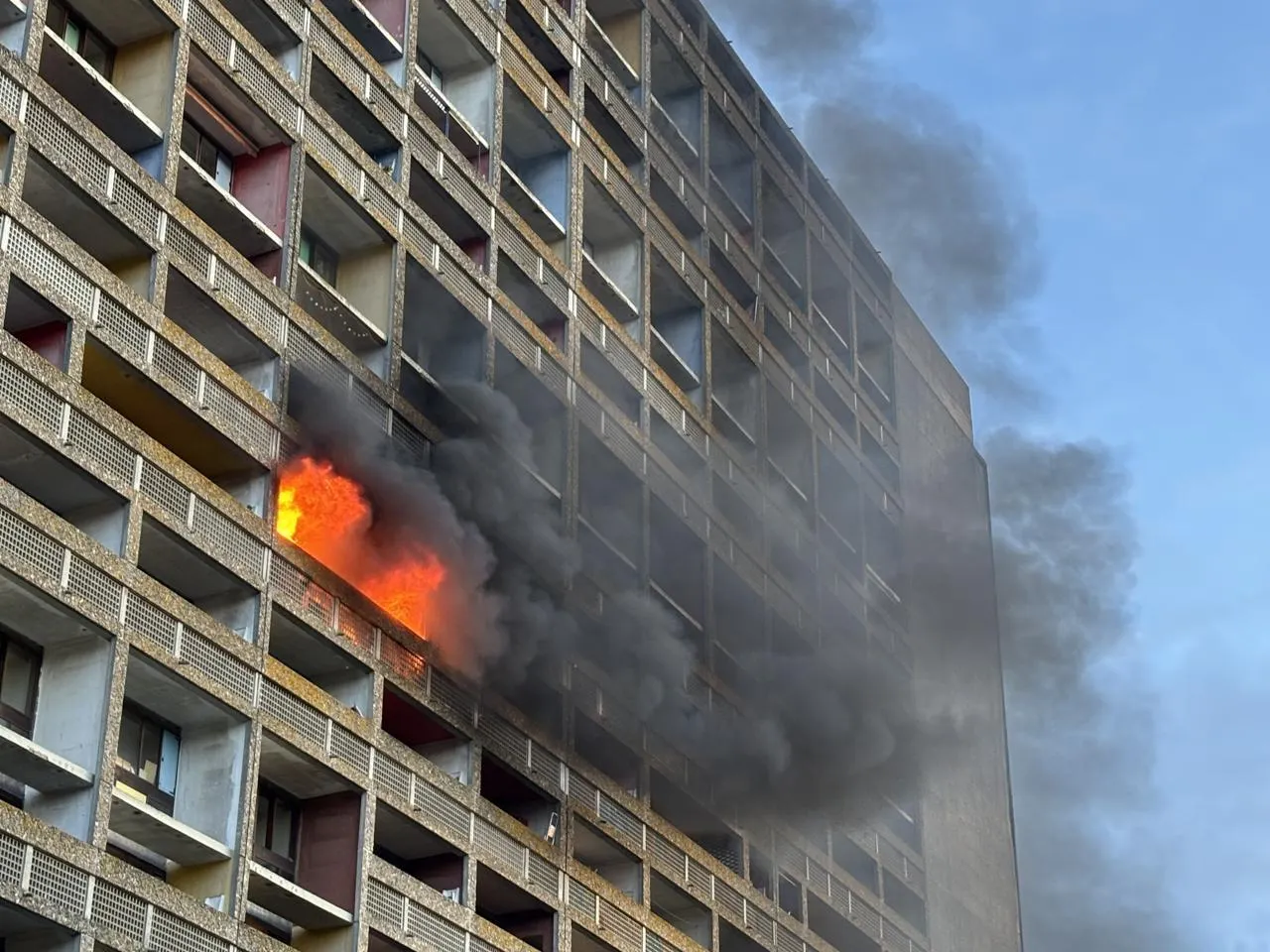 De grandes flammes sont visibles depuis l’extérieur et un grand panache de fumées s’en dégage. Une partie des habitants a été évacuée tandis que d’autres sont toujours à l’intérieur. Les sapeurs-pompiers nous ont conseillé de rester à l’intérieur, cela évite de créer des appels d’air