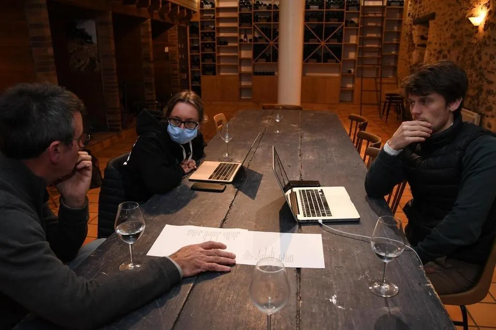 Thouarcé, le 26 novembre. Le vigneron du domaine des Grandes Vignes Jean-François Vaillant (à gauche) en pleine explication de textes avec les dégustateurs de la RFV, Pascaline Lepeltier et Alexis Goujard. © LAURENT COMBET