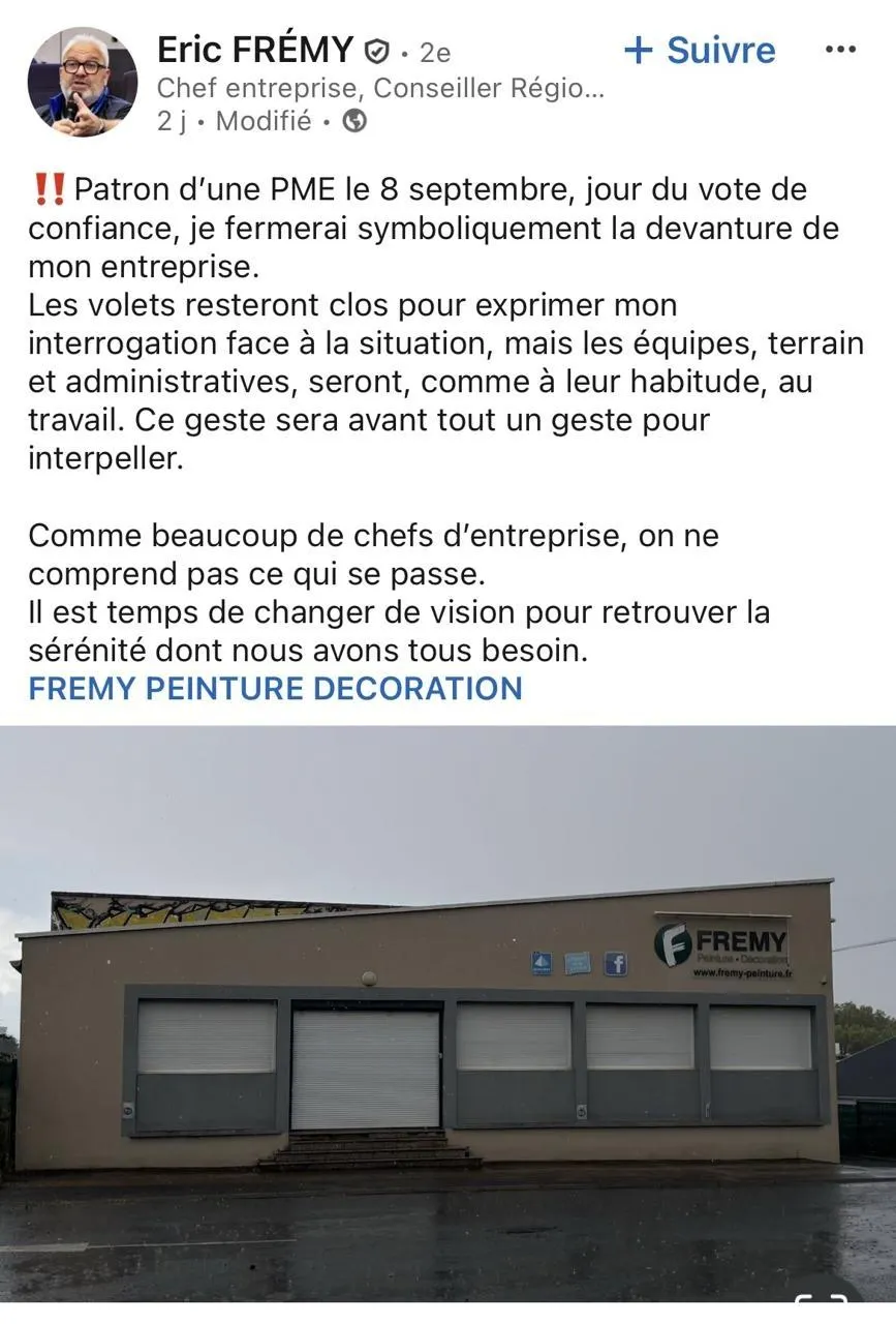 Patron de l’entreprise Frémy peinture, dont le siège est à Angers (Maine-et-Loire), celui qui est également conseiller régional (Horizons) en charge du commerce et de l’artisanat fait part, sur le réseau social LinkedIn, de son intention de fermer « symboliquement » la devanture de sa société le lundi 8 septembre 2025, jour du vote de confiance demandé par François Bayrou, le Premier ministre.