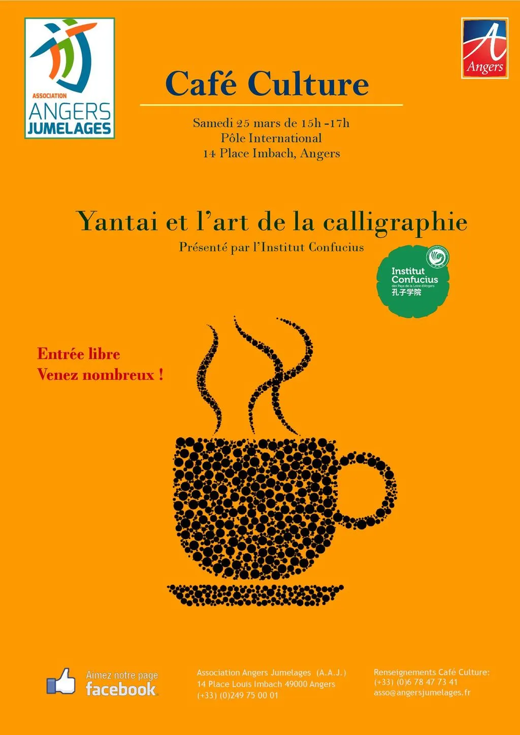 Le prochain Café Culture organisé par l'AAJ (Association Angers Jumelages) aura lieu le samedi 25 mars de 15-17h au Pôle International, 14 Place Louis Imbach. Ce Café Culture avec pour titre "Yantai et l'art de la calligraphie", sera présenté par l'Institut Confucius.
