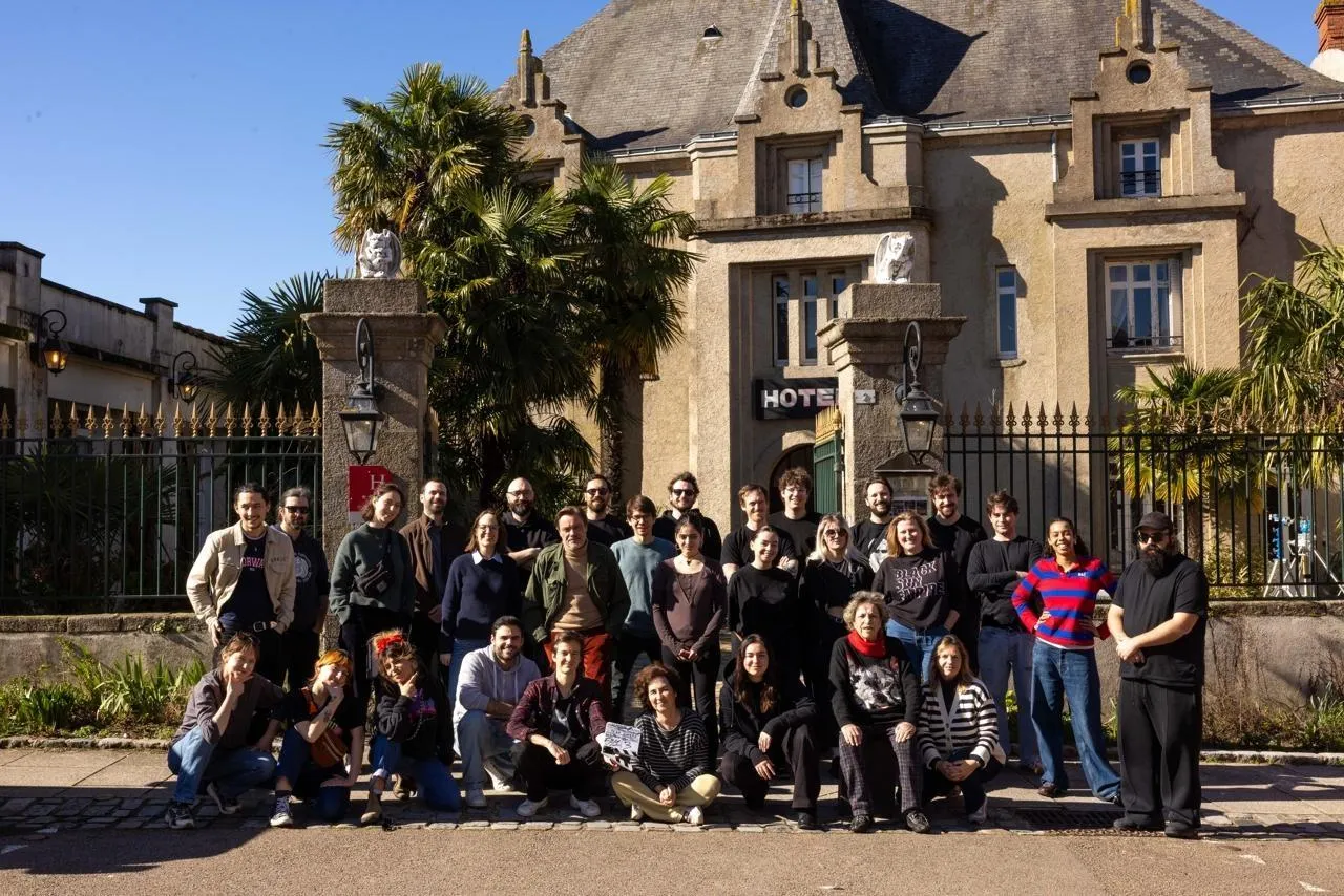 Toute l’équipe réunie devant le manoir de la Barbacane : Lucas B. Masson et Rita Blanco sont assis au premier rang (5e et 6e en partant de la gauche). Le film est en coproduction avec Trois jours de marche et Alajolie. © Maria Labzae