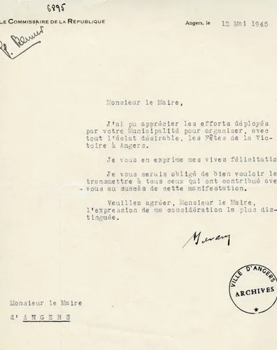 Le commissaire de la République, Alain Savary, remercie le maire pour l’organisation des fêtes de la Victoire, 12 mai 1945. Archives municipales Angers, 1 I 255.