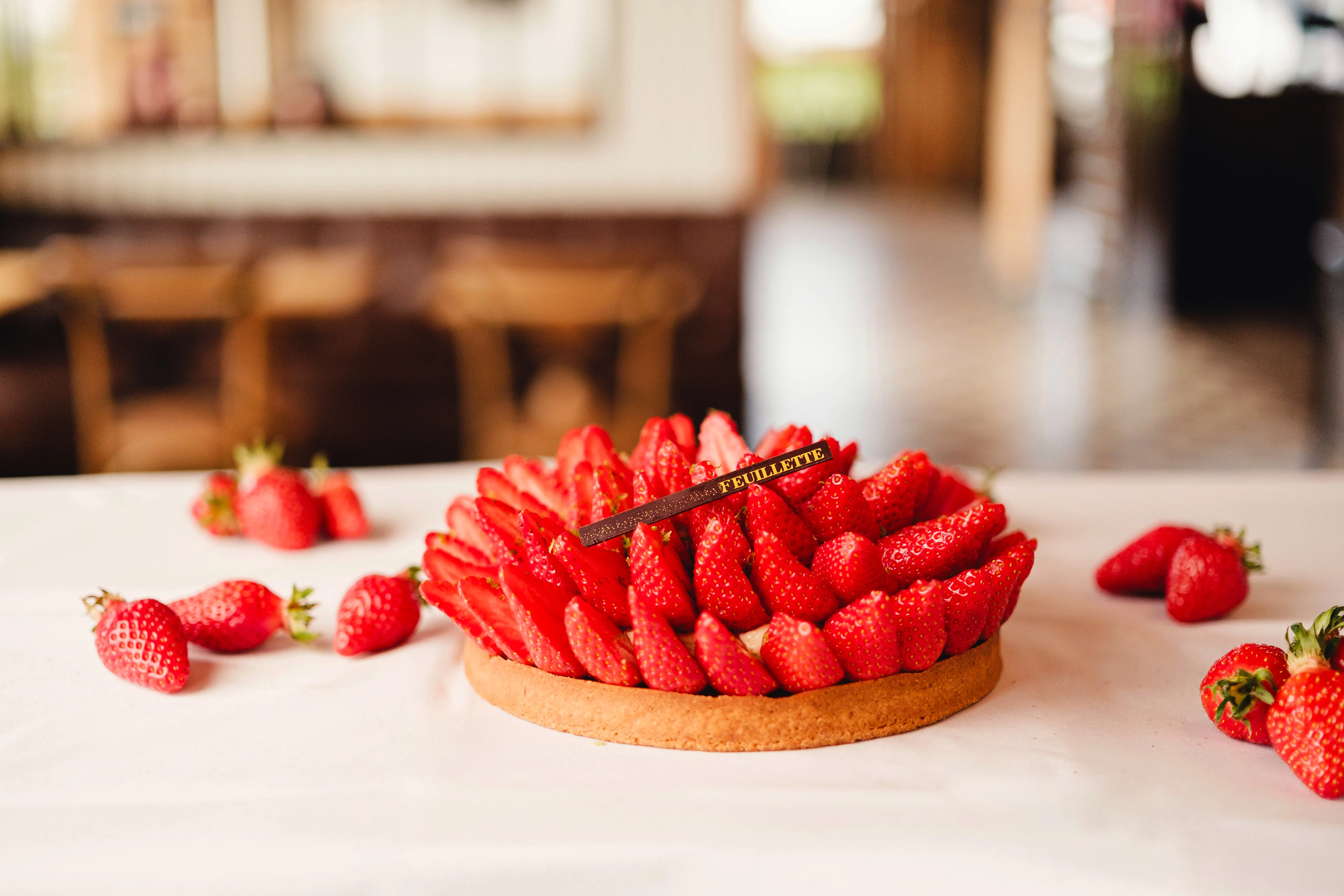Nous allons entrer dans la période de fruits rouges, avec notamment la fraise et la framboise. Notre prochaine star sera donc la tarte aux fraises, avec toujours des fraises de nos producteurs locaux. En base, on aura une pâte sablée, à l'amande. Mais attention, le sablé doit être caramélisé et bien croustillant, c'est comme ça qu'il est parfait !