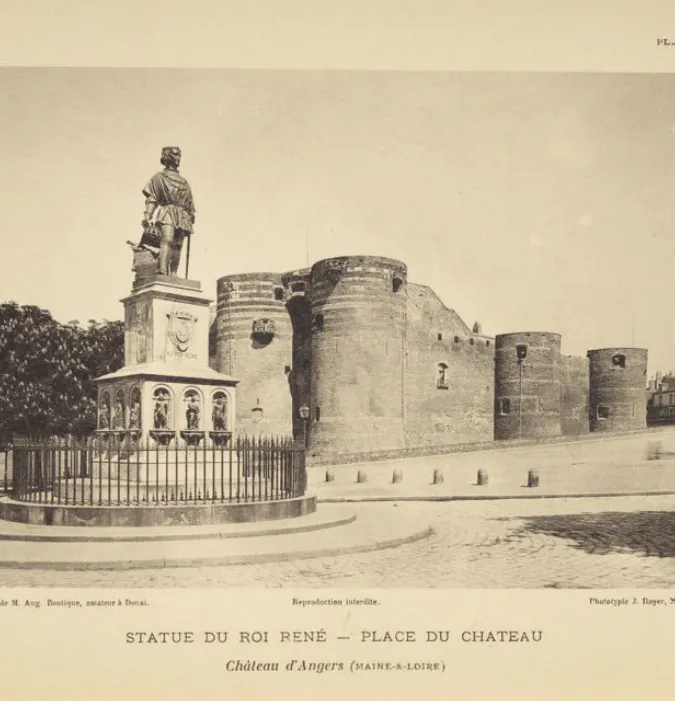 La statue est inaugurée à Angers en 1853. Elle est loin de la réalité des portraits que l’on connaît de René à la fin de sa vie. Le roi jeune et fier qui trône au pied du château arbore une coupe de cheveux au carré, totalement anachronique, empruntée à la mode du temps de Saint Louis (XIIIe siècle). Tout comme l’expression le « bon roi René », elle illustre en fait parfaitement ce Moyen Âge fantasmé que le Romantisme du XIXe siècle a popularisé dans le contexte du retour de la monarchie.