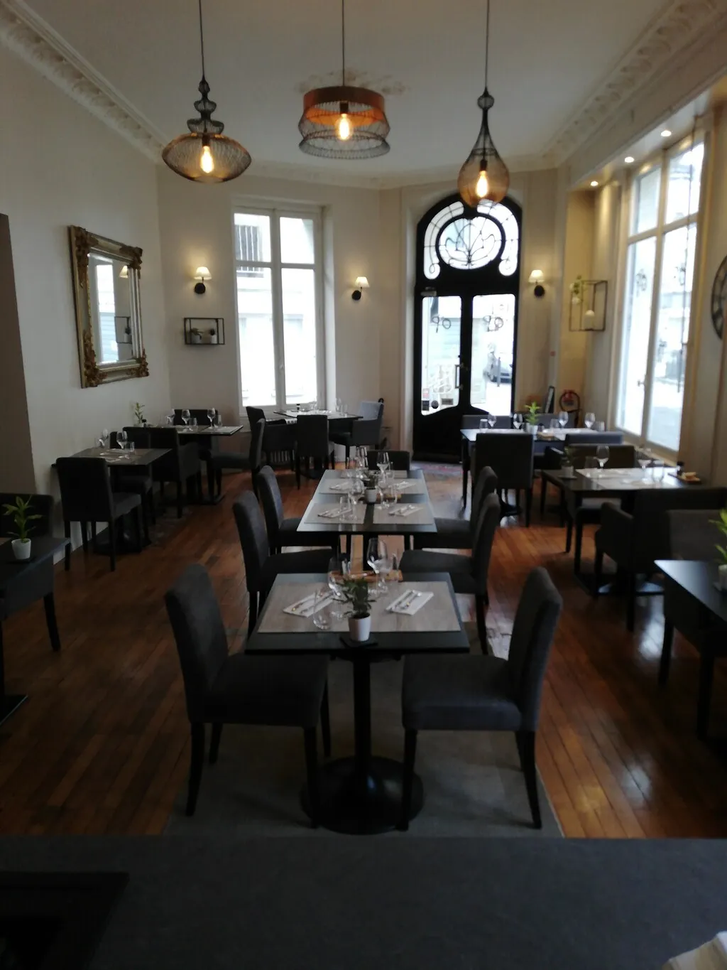 Comme dans les assiettes, le cadre mélange moderne et ancien. La hauteur est agréable et le décor raffiné. Le parquet, la pierre et les moulures forment un contraste harmonieux avec les luminaires design. On se sent bien dans cette salle, ni trop grande, ni trop petite. Elle permet d’accueillir 32 personnes assises mais, dès qu’il fait beau, on installe une dizaine de couverts dans la petite cour.