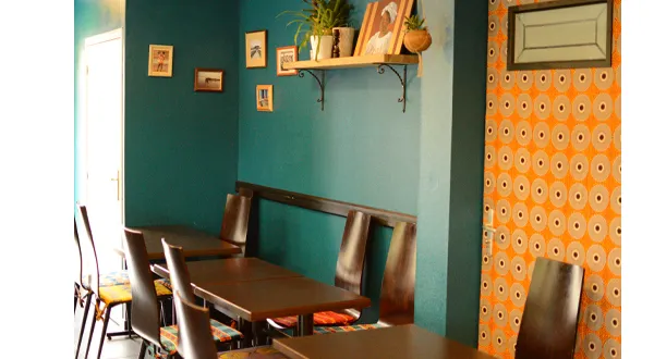 Chez Pastels Wax et Cie, on a de la couleur dans les assiettes et dans la déco. Les wax, des tissus africains cirés et colorés, animent les murs. Il y a aussi de nombreux objets et une bibliothèque. Le tout avec beaucoup de sourire.
