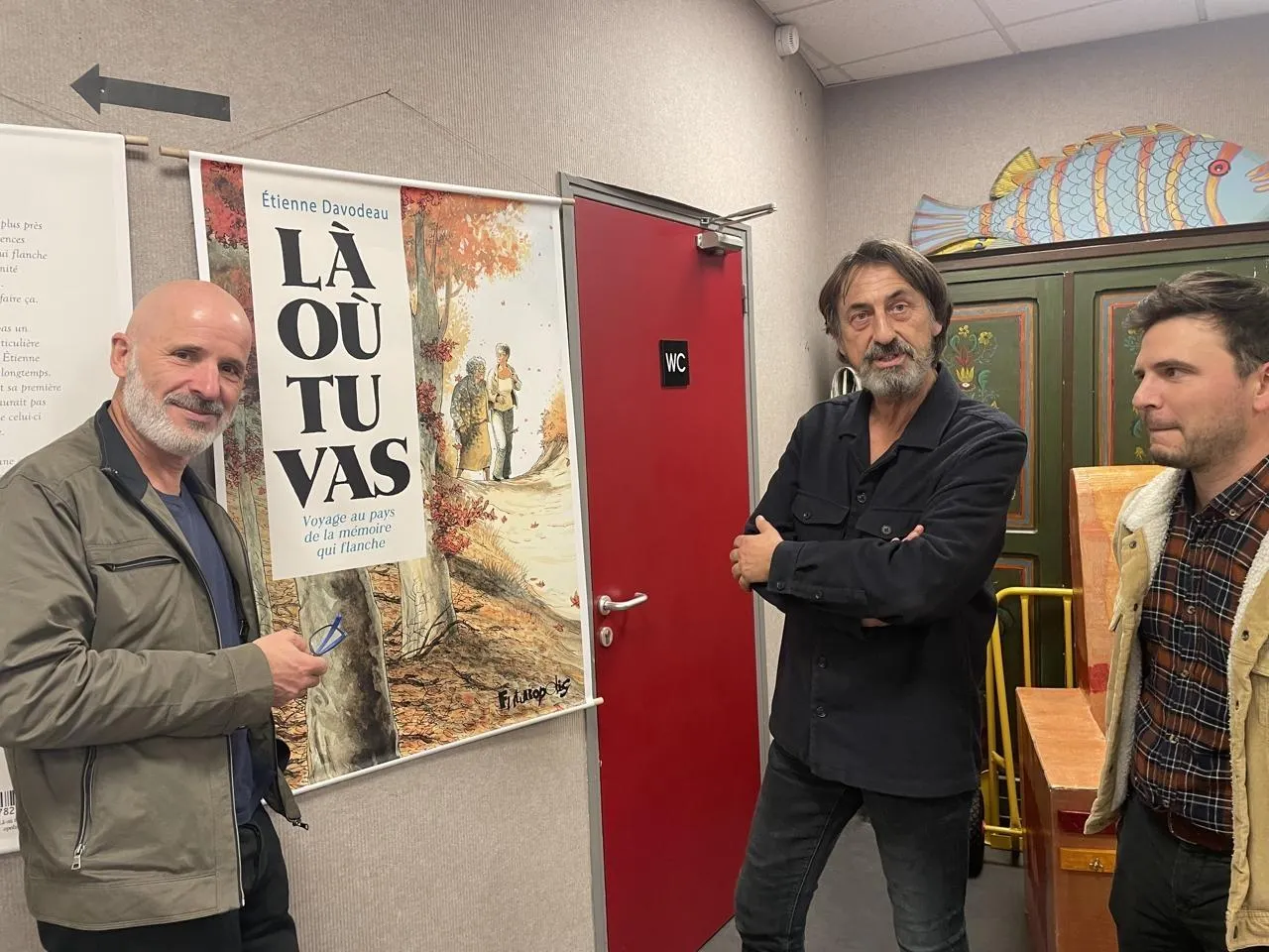 Étienne Davodeau (à gauche) en compagnie de Thierry Dupont, directeur de la médiathèque de Mûrs-Erigné et Julien Gaboriau, responsable du CCAS Mûrs-Érigné. © Ouest-France