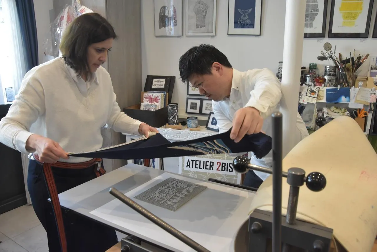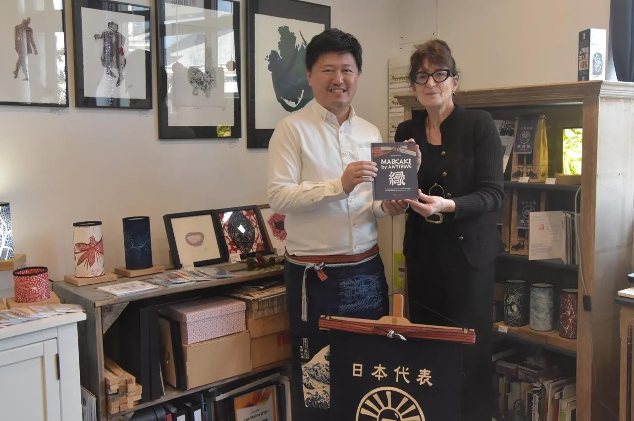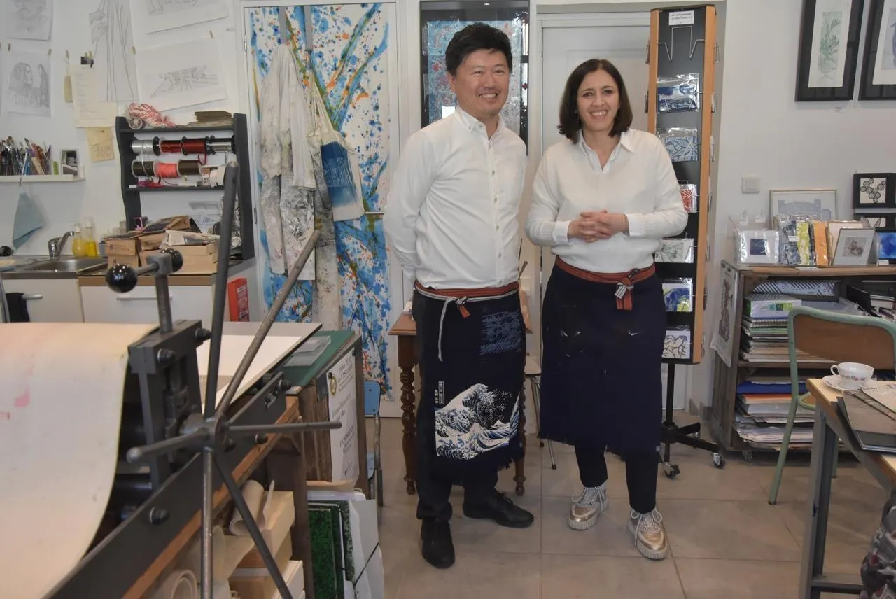 Kazuhiro Nishimura, entrepreneur qui fabrique des tabliers traditionnels japonais, en compagnie d’Emma-Özlem Kaya, artiste graveur à Châteauneuf-sur-Sarthe. © CO - Joël AUDOUIN