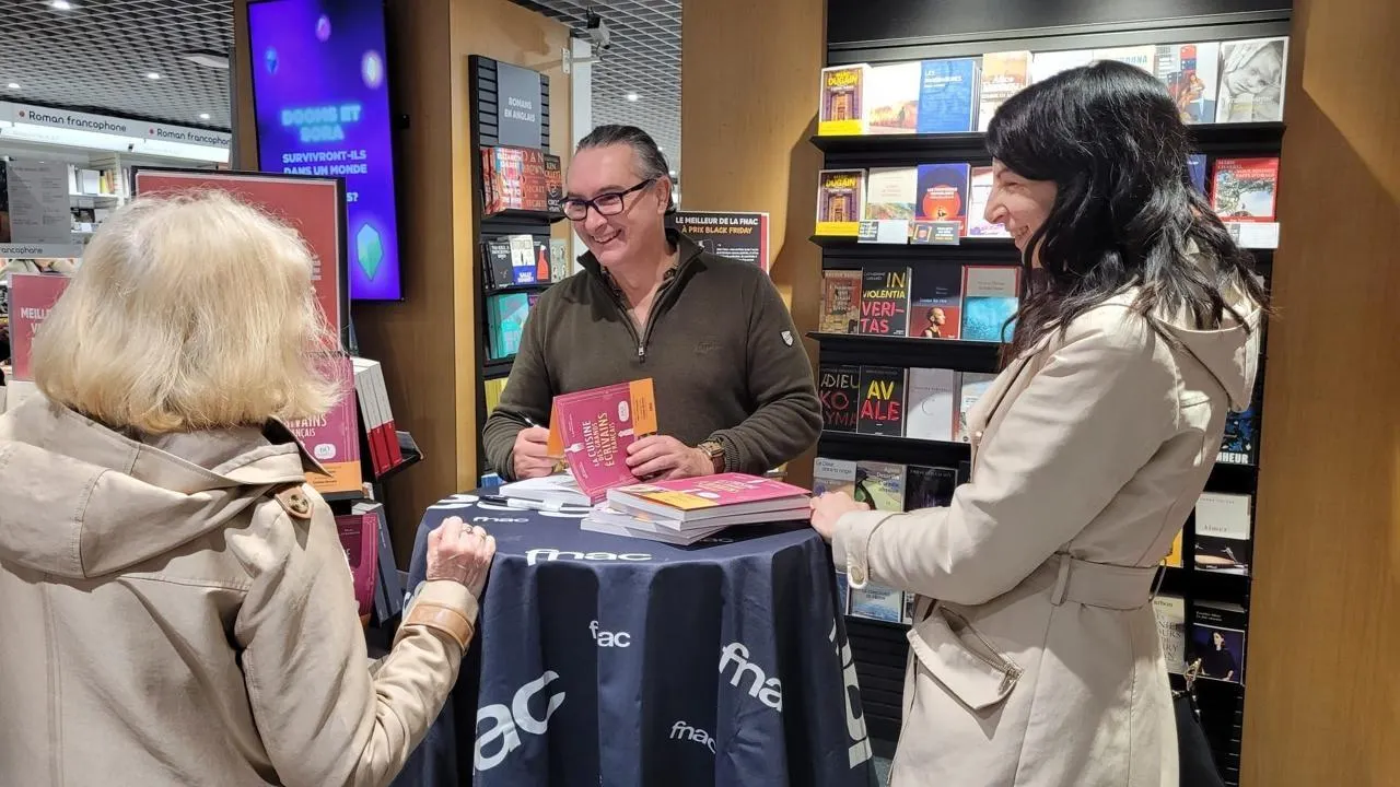 La Fnac d’Angers a accueilli le 15 novembre l’écrivain angevin Marc Lefrançois pour une séance de dédicaces autour de son tout dernier ouvrage, La cuisine des grands écrivains français, coécrit avec Émeline Bernard et publié aux éditions DBS. © Ouest-France