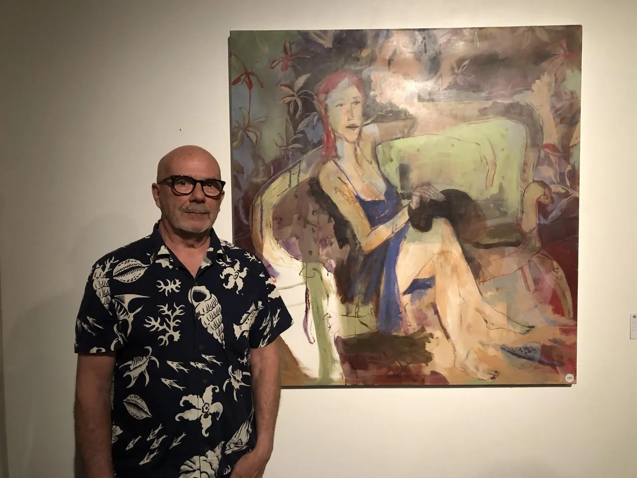 Trélazé, avril 2025. Denis Huneau a reçu le grand prix du 43e Salon de printemps des Lions Clubs d’Angers pour cette toile intitulée « Femme du chat ». © CO - Bruno JEOFFROY