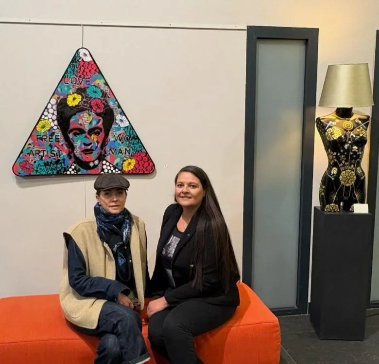 Sajo (à gauche) et Leïla Nabati posent, ici, au milieu de leurs œuvres qui explosent de couleurs vives, à la galerie Aubance aux Garennes-sur-Loire (Maine-et-Loire), lors du vernissage de l’exposition qui s’est tenue le jeudi 20 novembre 2025. © Ouest-France