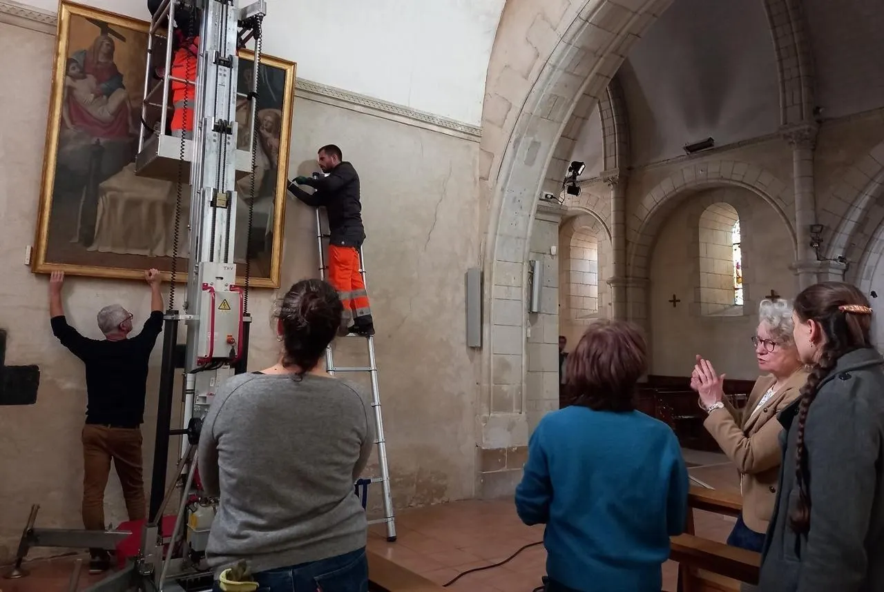 Vendredi 14 novembre 2025, les agents de la commune de Saint-Barthélemy-d’Anjou (Maine-et-Loire) ont procédé à la réinstallation, à sa place initiale, du tableau parfaitement restauré. © Ouest-France