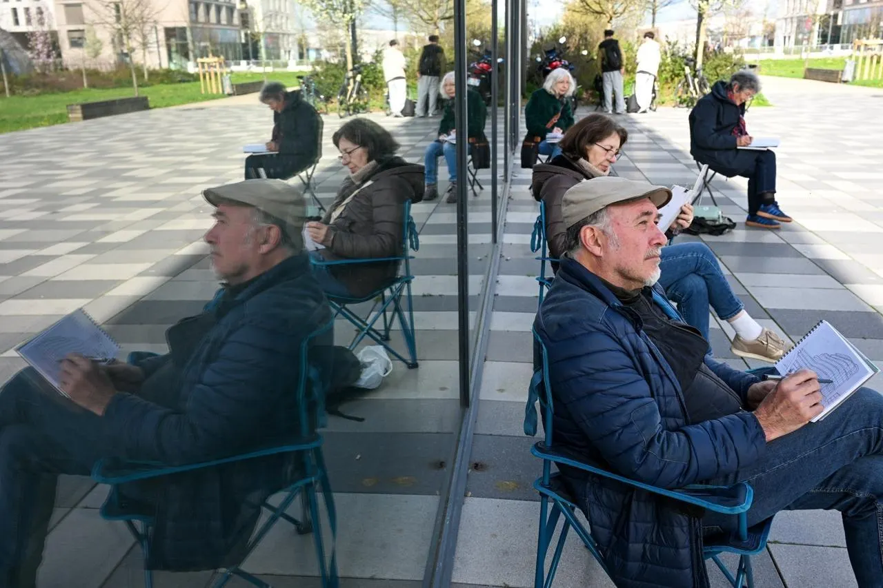 Angers, 14 mars 2026. Face à la patinoire ou aux immeubles tertiaires, les Urban Sketchers ont croqué des instantanés de vie dans le quartier. © CO – Laurent Combet