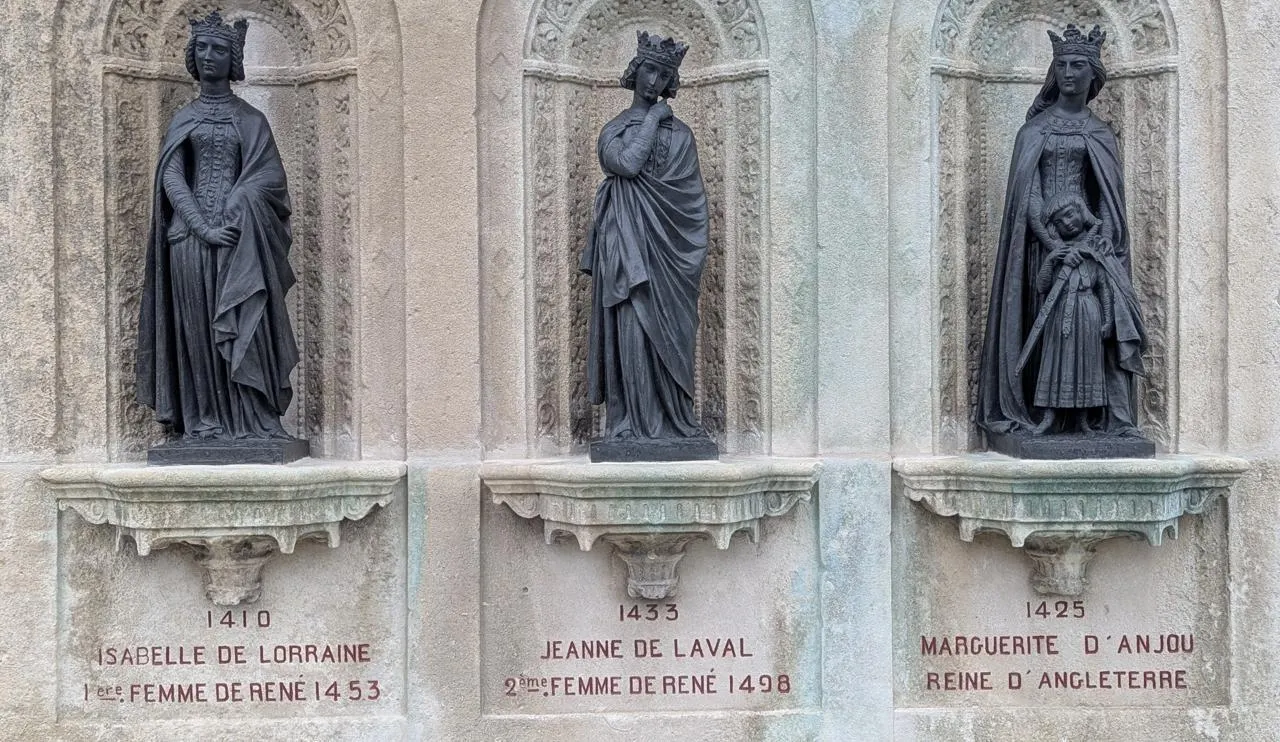 Ces dernières représentent des personnalités de l’Anjou, dont le Gaulois Dumnacus ou Foulques Nerra, redoutable guerrier. Le tout, dans l’ordre chronologique. Enfin presque. Car sur l’un des versants du socle, Isabelle de Lorraine (née en 1410) précède Jeanne de Laval, née en 1433… et Marguerite d’Anjou, née quant à elle en 1425 (ou 1430 selon d’autres sources).