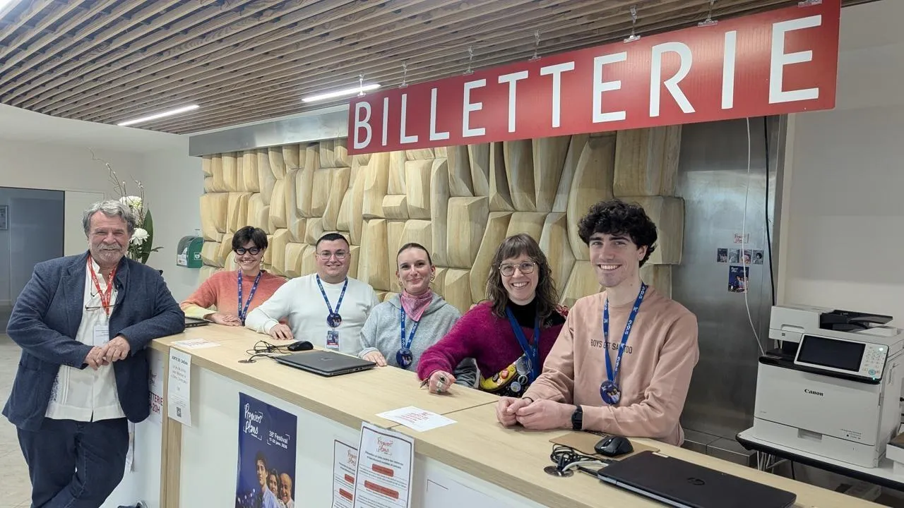 De gauche à droite : Jacques Chambrier, le trésorier du festival Premiers plans, et l’équipe de la billetterie du centre de congrès : Marie Neple, Dorian Groneau, Tiphaine Lefrançois, Lisa Bertrand et Antonin Fouché (absent sur la photo : Romane Crasnier-Martin) © Ouest-France