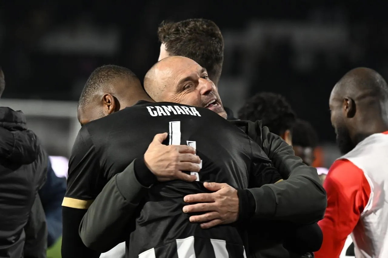 Alexandre Dujeux et Ousmane Camara peuvent s’étreindre : le Sco a basculé dans la première partie de tableau en Ligue 1. © Marc Ollivier/Ouest-France