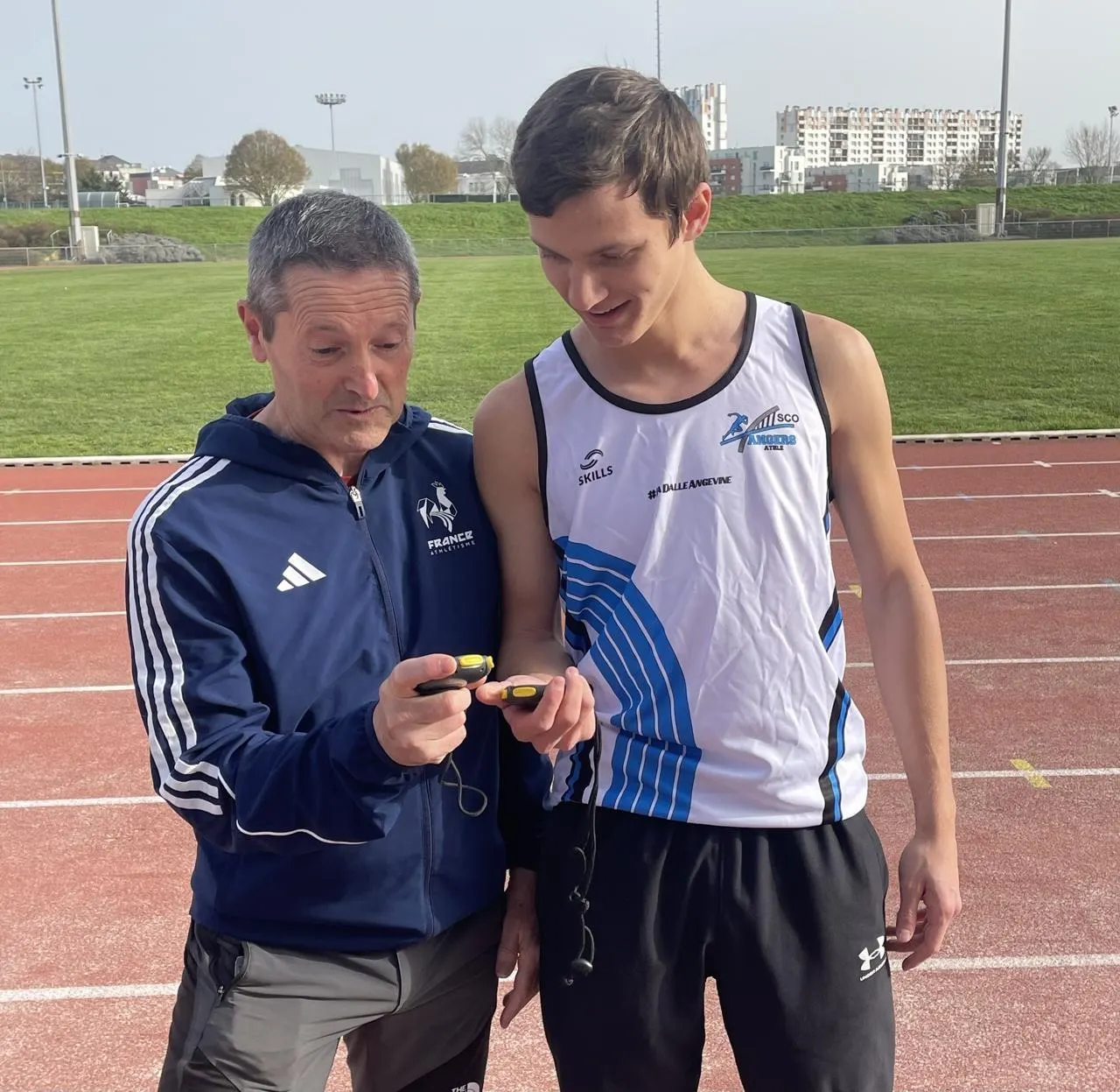 Jean-Michel Mareau et Thibaut Gromala. L’entraîneur et l’athlète constatent les chronos du jeune sprinter. © Ouest France