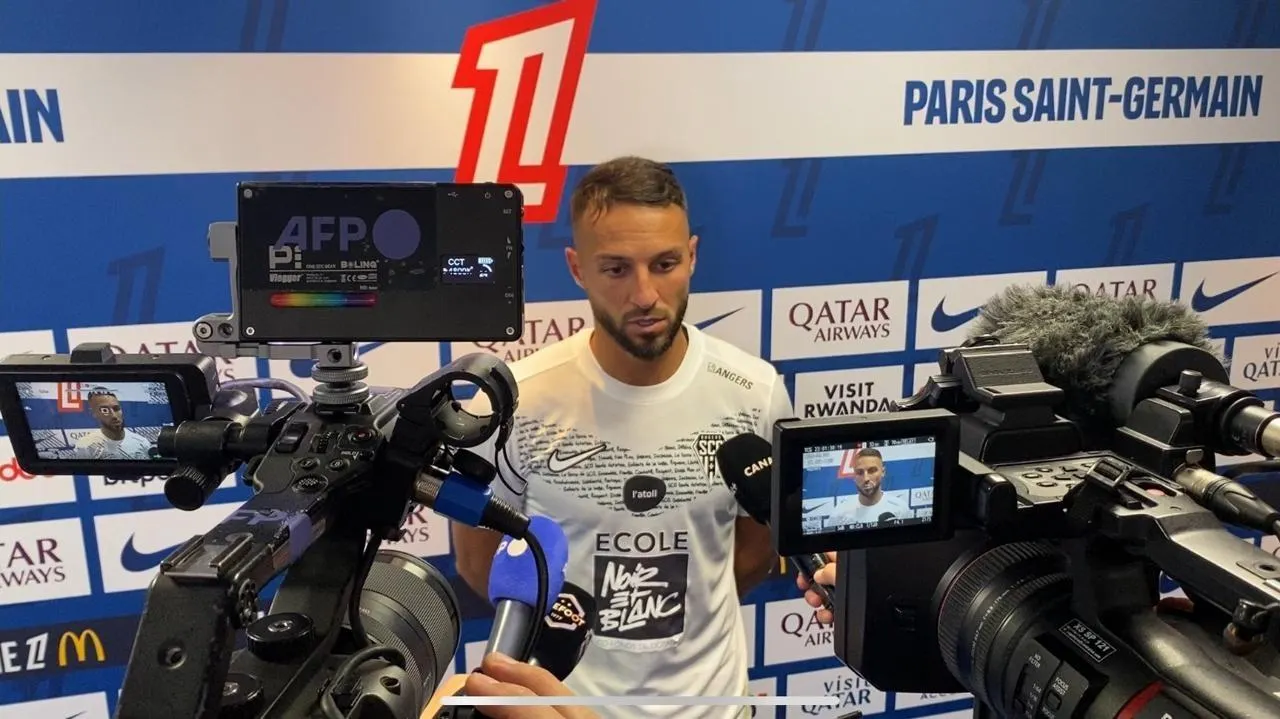 Haris Belkebla, capitaine d’Angers Sco, en zone mixte après la défaite contre le PSG lors de la deuxième journée de Ligue 1. © Ouest-France