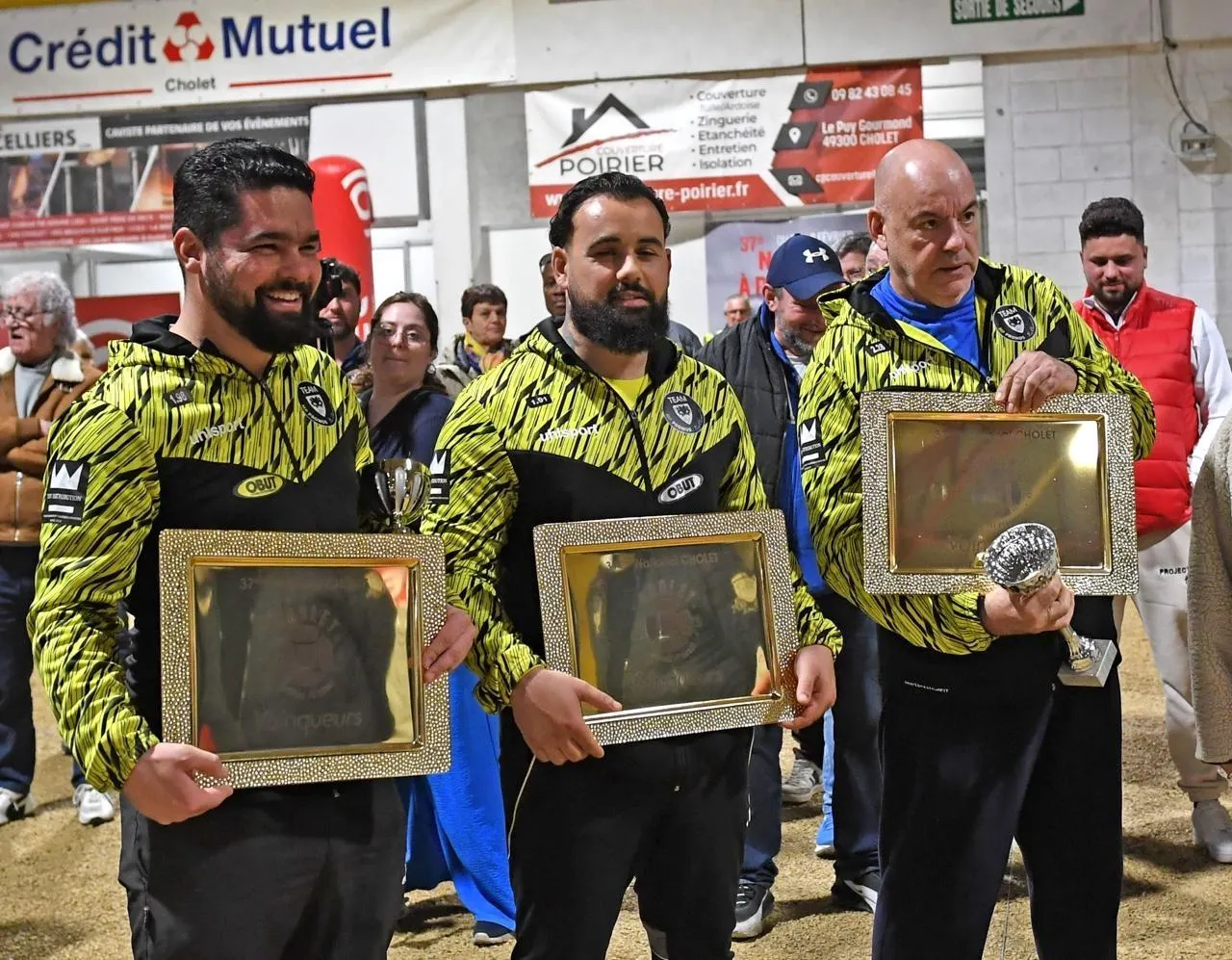 Cholet, la Meilleraie, dimanche 8 février 2026. Magny Baldwin, Ligan Doerr et Patrick Coppa (de gauche à droite), les vainqueurs du National à pétanque 2026. © CO - Étienne Lizambard