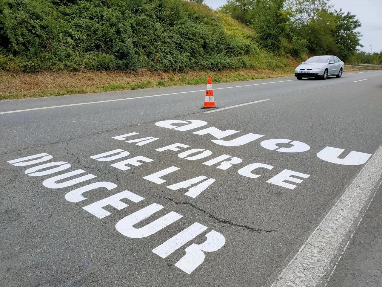 Au-delà de l’enjeu sécuritaire, le Département de Maine-et-Loire aimerait promouvoir son territoire à travers le Tour. Des marquages au sol ont été apposés. © Ouest-France