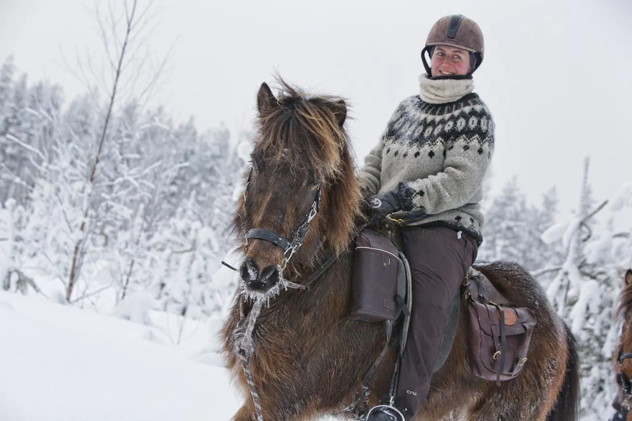 Floriane Colonnier, montant Leó, un des 11 chevaux islandais de la ferme équestre « Horses of Taïga », qu’elle gère avec sa compagne Rianne Kindt dans le nord de la Suède, à Svansele, hameau de 62 habitants. © Rianne Kindt