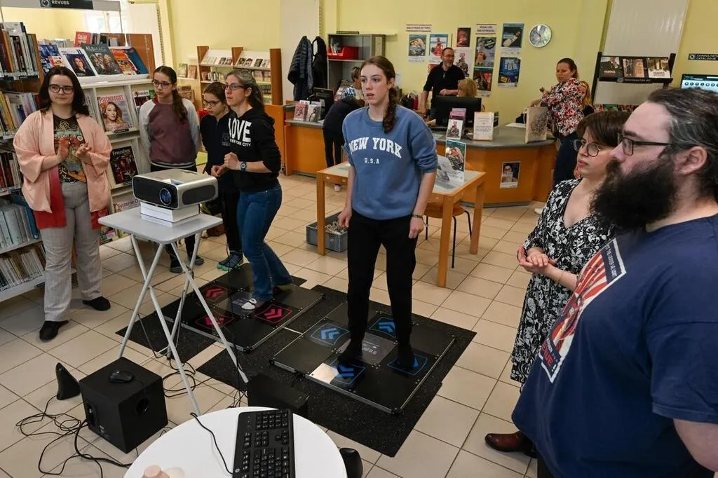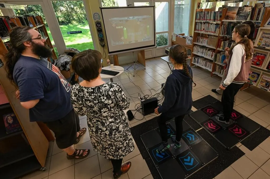 Tiercé, bibliothèque, le 29 mars 2025. Dans le cadre de « Bibs en jeux », organisé dans les bibliothèques En Anjou Loir et Sarthe, Soleil Levant proposait samedi des séances de Dance Dance Revolution pilotées par Louna-Jeanne Aubry (à gauche), Angèle Combet et Yann Chenet (à droite). ©  CO - Laurent COMBET