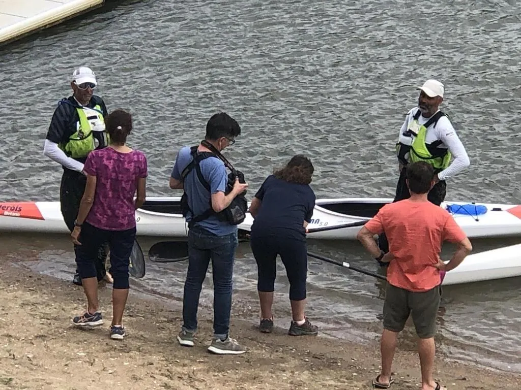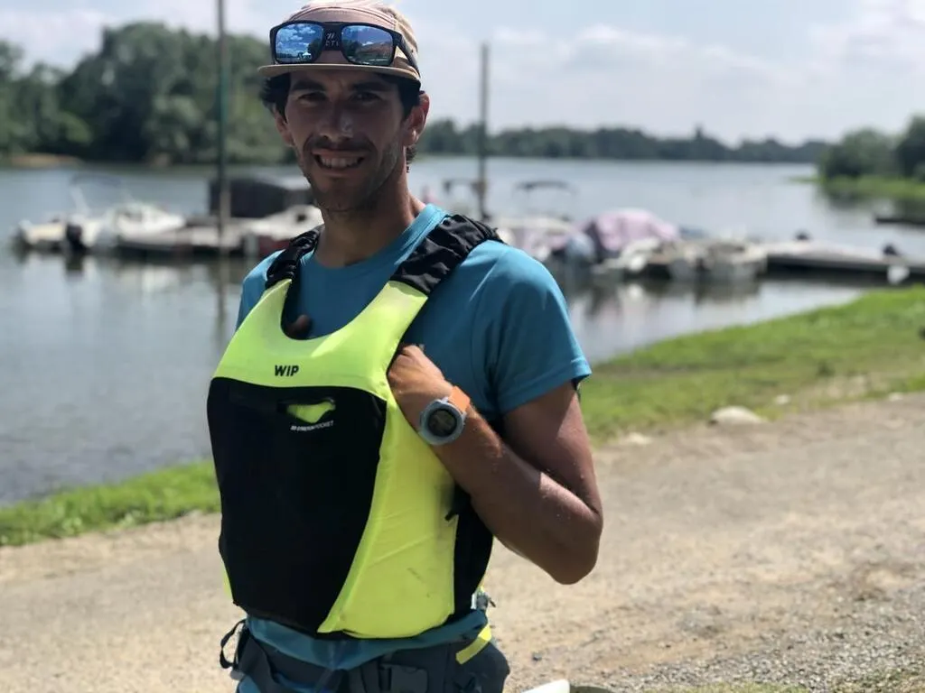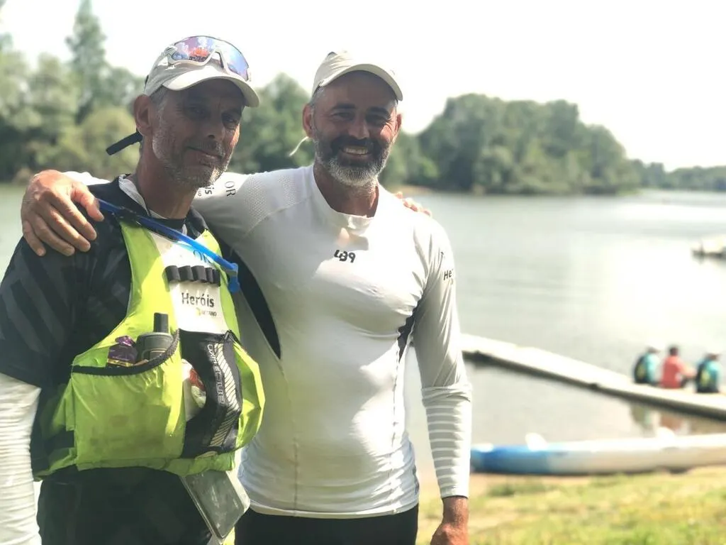 Bouchemaine, base nautique, le 12 juin 2025. L’équipage portugais, formé d’Antonio Palavra et Luis Vieira, en kayak biplace, occupe la tête du classement et pourrait battre le record. © CO