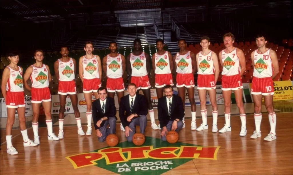 Cholet Basket saison 1987-1988 (N1A). Debout (de à dr) : Rigaudeau (n° 14), Ruiz (4), Warner (9), Brangeon (15), Austin (11), N’Doye (12), Ville (8), Bilba (6), Lopez (13), Dobbels (7), Chevrier (10). Accroupis, de g à dr : Laurent Buffard (entraîneur adjoint), Jean Galle (entraîneur) et Gilles Bernard (kiné). © ARCHIVES OUEST FRANCE
