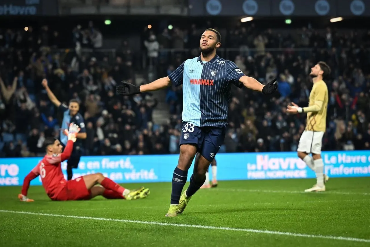 Le Havrais Noam Obougou-Jacquet crucifie le SCO à la 81e minute, sous les regards dépités de Zinga et Lefort. © AFP