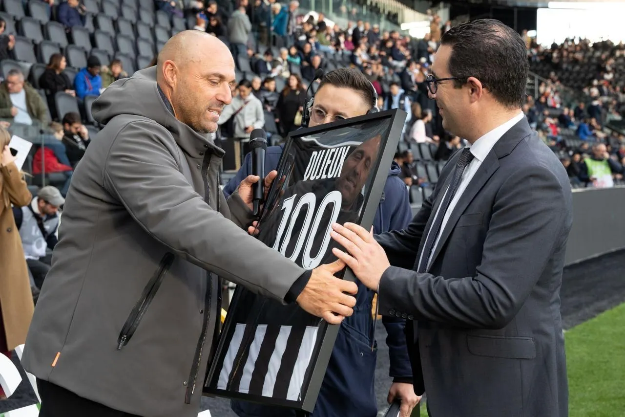 Alexandre Dujeux, qui reçoit ici un maillot du président Romain Chabane, a célébré sa 100e sur le banc angevin par un succès. © REGINE LEMARCHAND