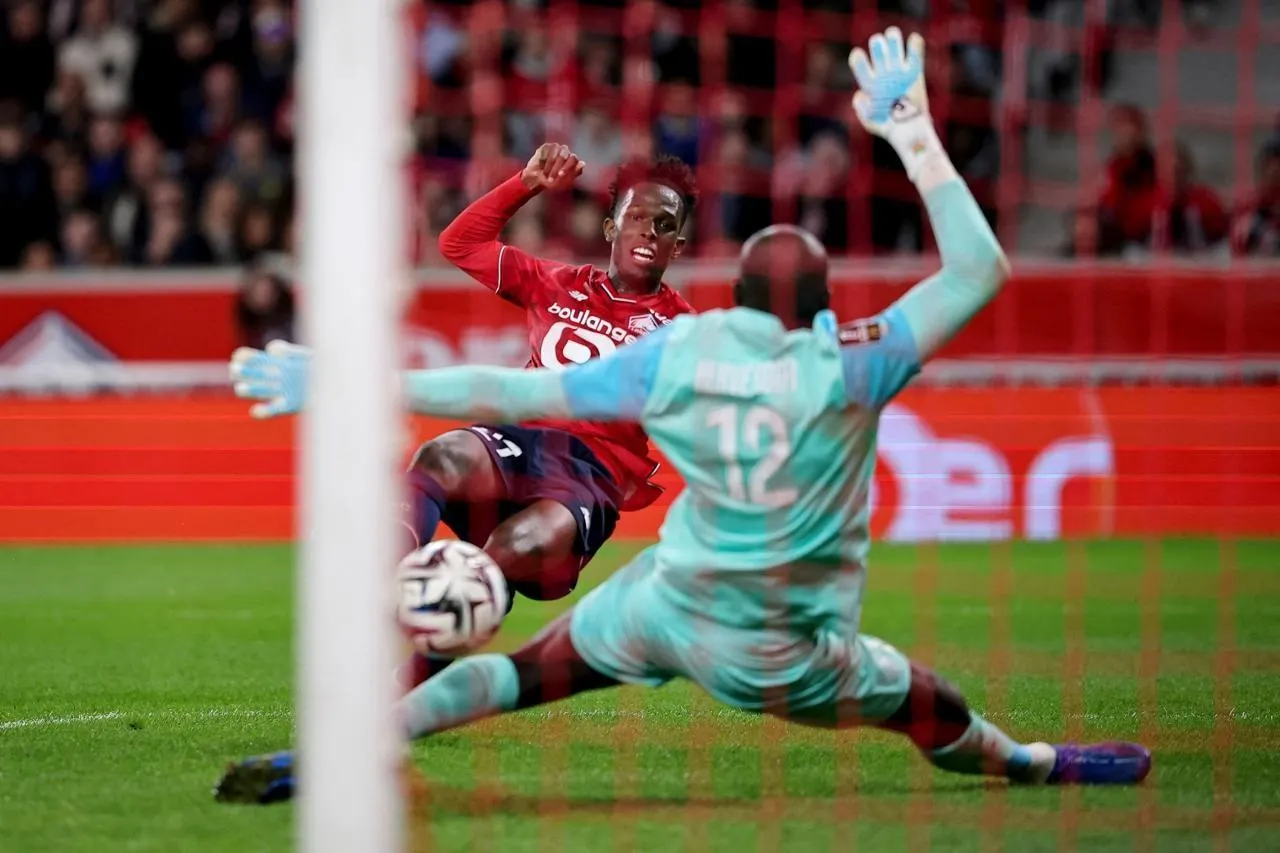 45e+ 2 : numéro technique de Bouaddi devant la surface avant de servir Correia dans la profondeur. L’attaquant nordiste trompe Koffi en ouvrant son pied.
