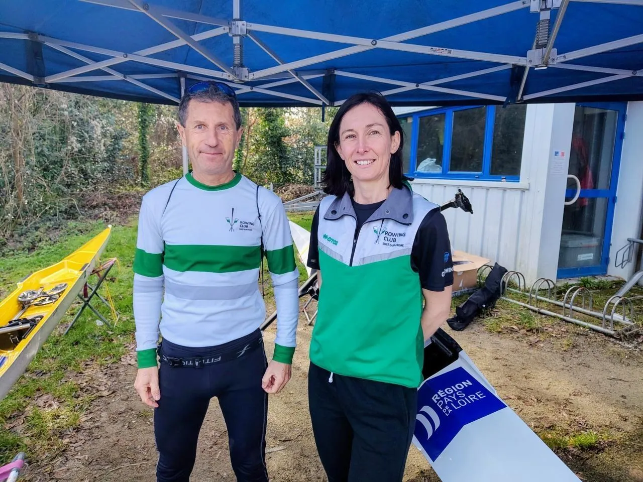 Gérard Chataigner et Fabiola Georges, sourire aux lèvres, ont récupéré deux skiffs neufs ce dimanche pour le Rowing Club de Sucé-sur-Erdre. © Ouest-France