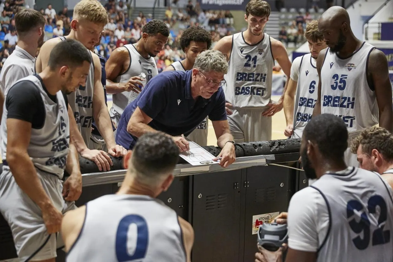 Pascal Thibaud en train de donner ses consignes lors de la rencontre entre le Cep Lorient basket et Vitré, le 18 août 2025. © Morgane LE GUEN