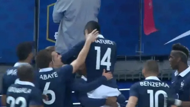 Blaise Matuidi est félicité par ses coéquipierq après avoir inscrit un but splendide face aux Pays-Bas. © Capture d'écran Wat TV