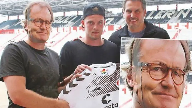 À Sankt Pauli, on ne manque pas d'idées. Par exemple, quand l'entraîneur est absent, on le remplace par un masque. C'est ce qui vient de se passer ce mercredi à l'occasion de la présentation de sa nouvelle recrue, l'attaquant Marvin Ducksch. Absent pour la signature du joueur, l'entraîneur Ewald Lienen était pourtant bien "présent" pour la photo, représenté par son masque.