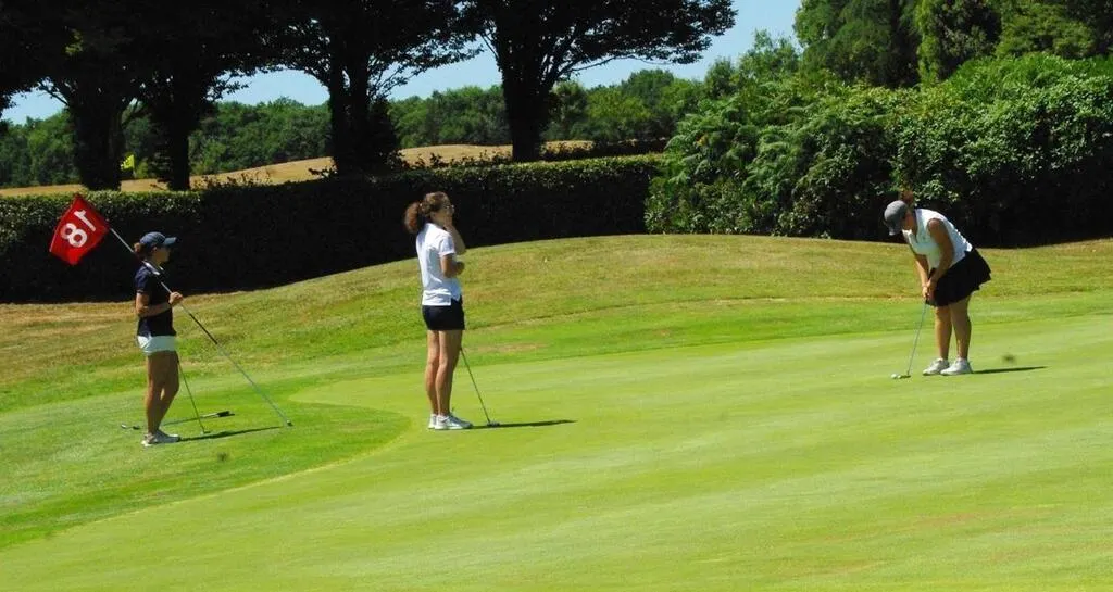 Au putt sur le dernier green, à droite, Camille Guitton (La Freslonnière) devant Sophie Delfosse (Bondues) et Lou Fourdan (Saint-Laurent) se disputeront la victoire finale chez les dames. © Ouest-France