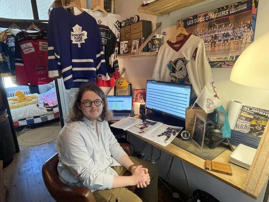 Dans son bureau entièrement dédié au hockey sur glace, Nino Bourge-Maldinez décortique les matches des Ducs d’Angers. © RB