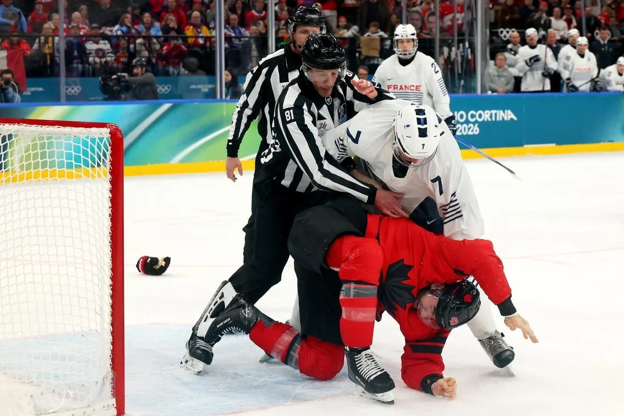 Pierre Crinon s’est battu contre le Canadien Tom Wilson durant les JO 2026. © BRUCE BENNETT / Getty Images via AFP