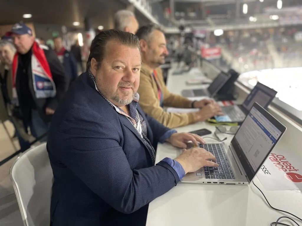 Juho Jokinen dans la tribune de presse de l’IceParc mardi soir, pour Ouest-France. © RB
