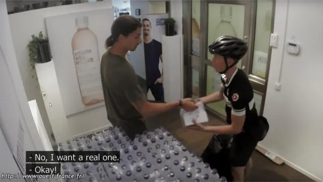 On y voit le géant moustachu au catogan, connu pour être un grand chambreur, piéger un coursier à vélo dans les locaux de la société. Une palette de bouteilles trône dans le couloir. Ibrahimovic demande au coursier d'ouvrir son - grand - sac à dos. Il y enfourne un pack de douze bouteilles, puis deux, puis trois, quatre, cinq… Le jeune homme, qui vient de quémander un autographe, commence à suer…