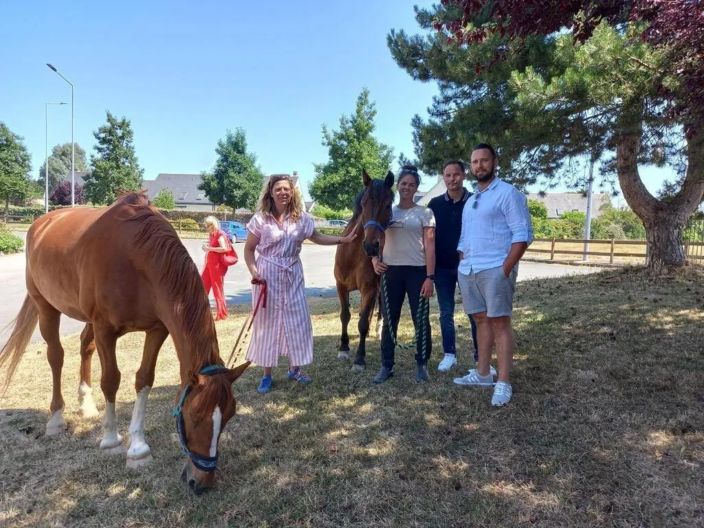 Au centre équestre, Géraldine Vincelot, éducatrice à l’Itep les Oliviers, avec El Donuts ; Pauline Jarno, médiatrice équine, avec Cam ; Arnaud Le Bourg, chef de service à l’Itep ; et Jérémie Bonneau, psychologue et doctorant en psychologie. © Ouest-France