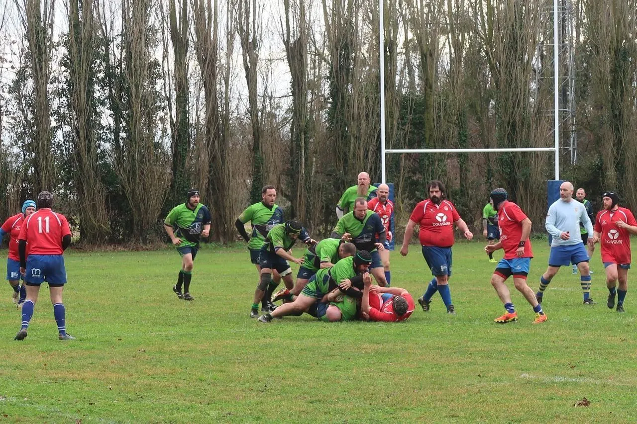 Brion, le 18 janvier 2026. Avant le temps officiel d’inauguration, le terrain de rugby a accueilli un match triangulaire amical, entre Les Rhinos 49 (en vert et noir), Les Vieux Crampons du Mans (en rouge) et le Rugby-club lavallois. © CO – Agathe LE NUEFF
