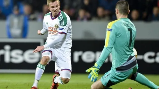 Philipp Schobesberger a probablement marqué le but le plus original de la soirée de jeudi en Ligue Europa, avec le Rapid de Vienne face au Viktoria Plzen. © Photo : EPA/MAXPPP