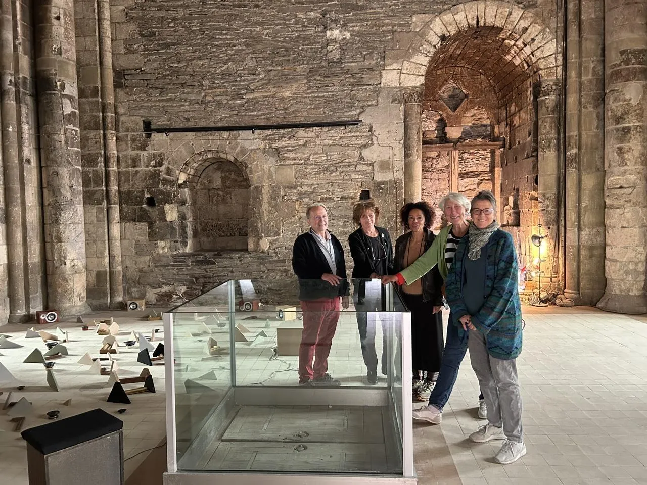 Angers, Tour Saint-Aubin, le 24 septembre 2025. Claude-Henri Sellès, commissaire de l’exposition, aux côtés des coprésidentes de l’association Ateliers d’artistes, Anne Lepont, Carole Nicolas, Pascale Messina et Béatrice Corfmat-Moulun. © CO
