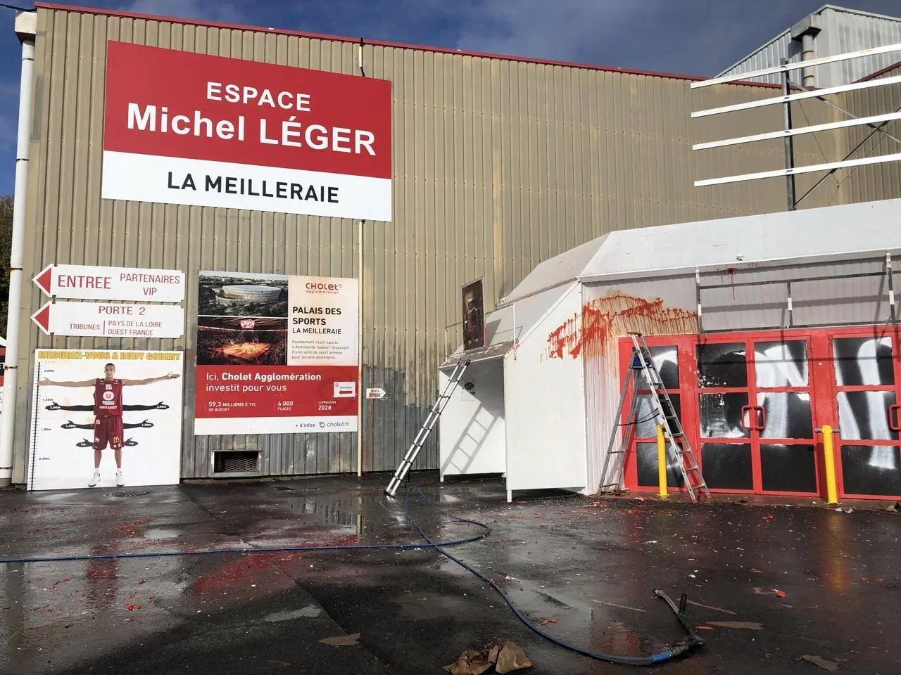 Les tags de la devanture de l’espace de la Meilleraie en train d’être effacés, lundi 20 octobre 2025. Ils ont été inscrits dans la nuit du vendredi 17 au samedi 18 octobre 2025, pour protester de la venue d’un club israélien mercredi 22 octobre 2025. © Ouest-France