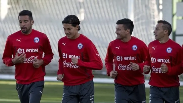 Miiko Albornoz (deuxième en partant de gauche), ici aux côtés de Mauricio Isla, Charles Aranguiz et Marcelo Diaz. © Photo : AFP